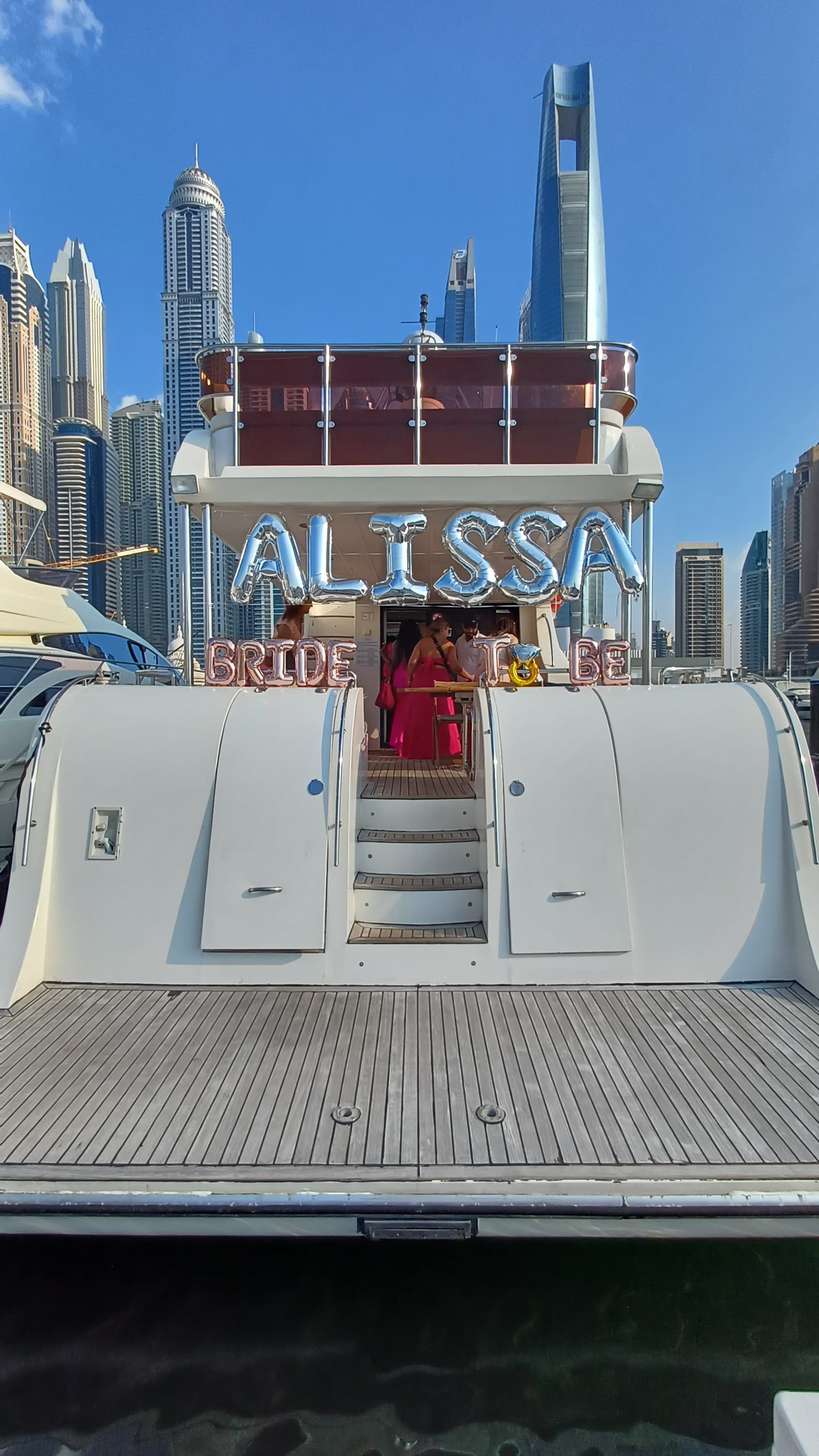 Celebrate the bride-to-be in style aboard a luxury yacht in Dubai! Sail past iconic landmarks like Dubai Marina, JBR, Palm Jumeirah, and Atlantis while enjoying a beautifully decorated yacht, music, and refreshments. Capture unforgettable moments with stunning skyline views, creating memories to last a lifetime. Perfect for an elegant and fun bridal celebration on the water!