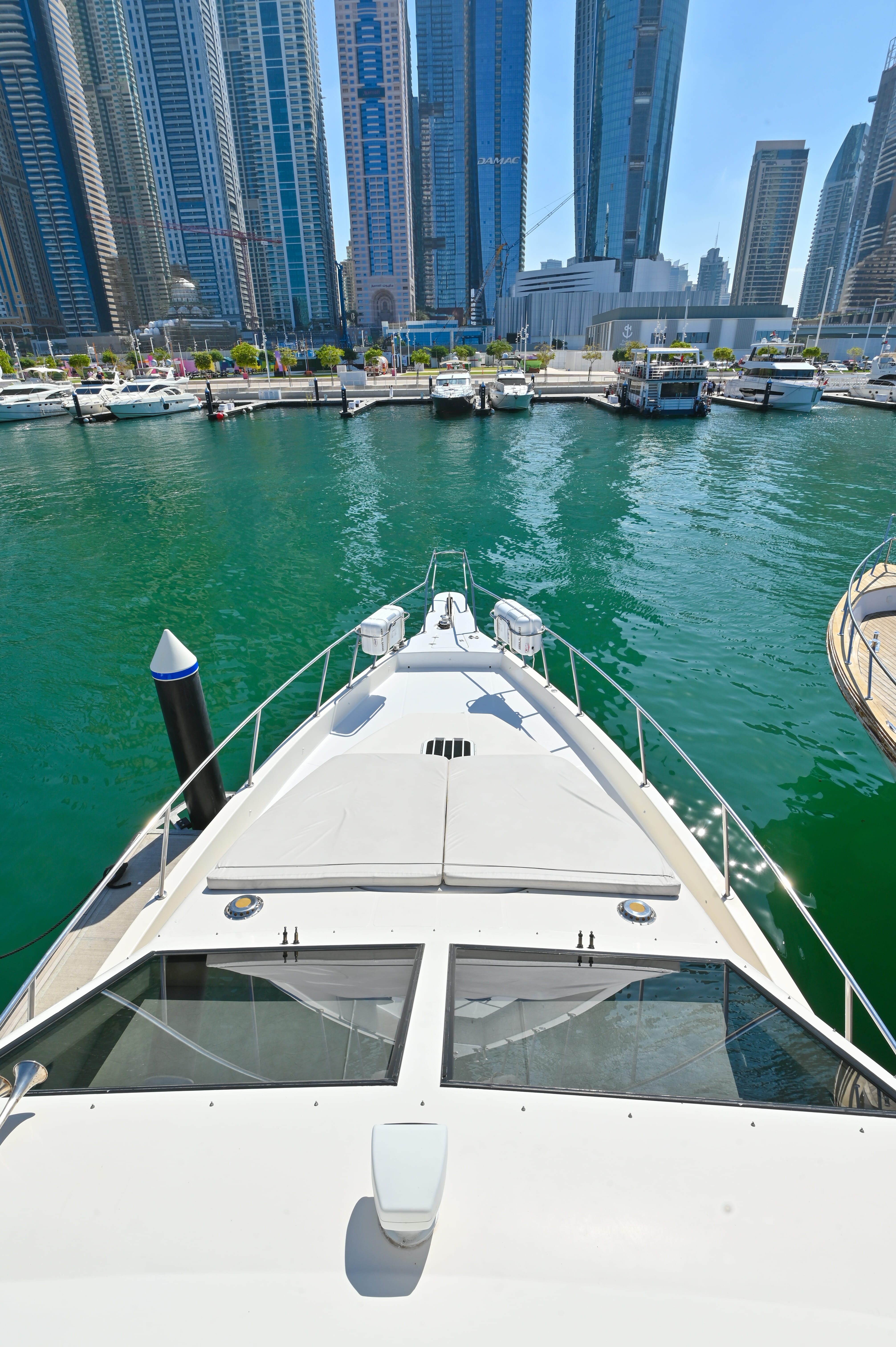 Step aboard the opulent vessel that is your gateway to an unforgettable journey across the shimmering waters of Dubai. As you ascend onto the deck of the 75-foot yacht, the air is electrified with anticipation, tinged with the promise of adventure and luxury.