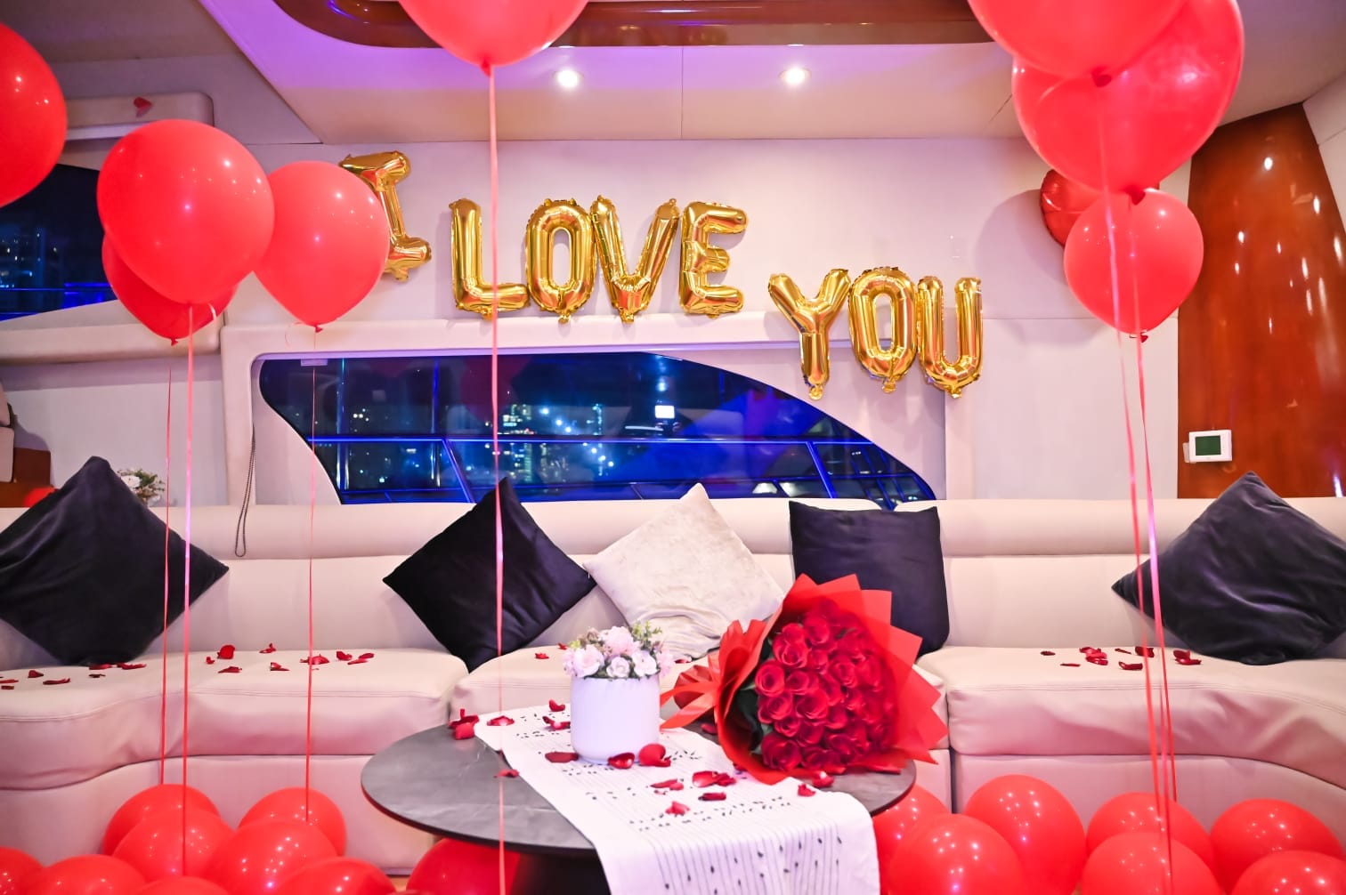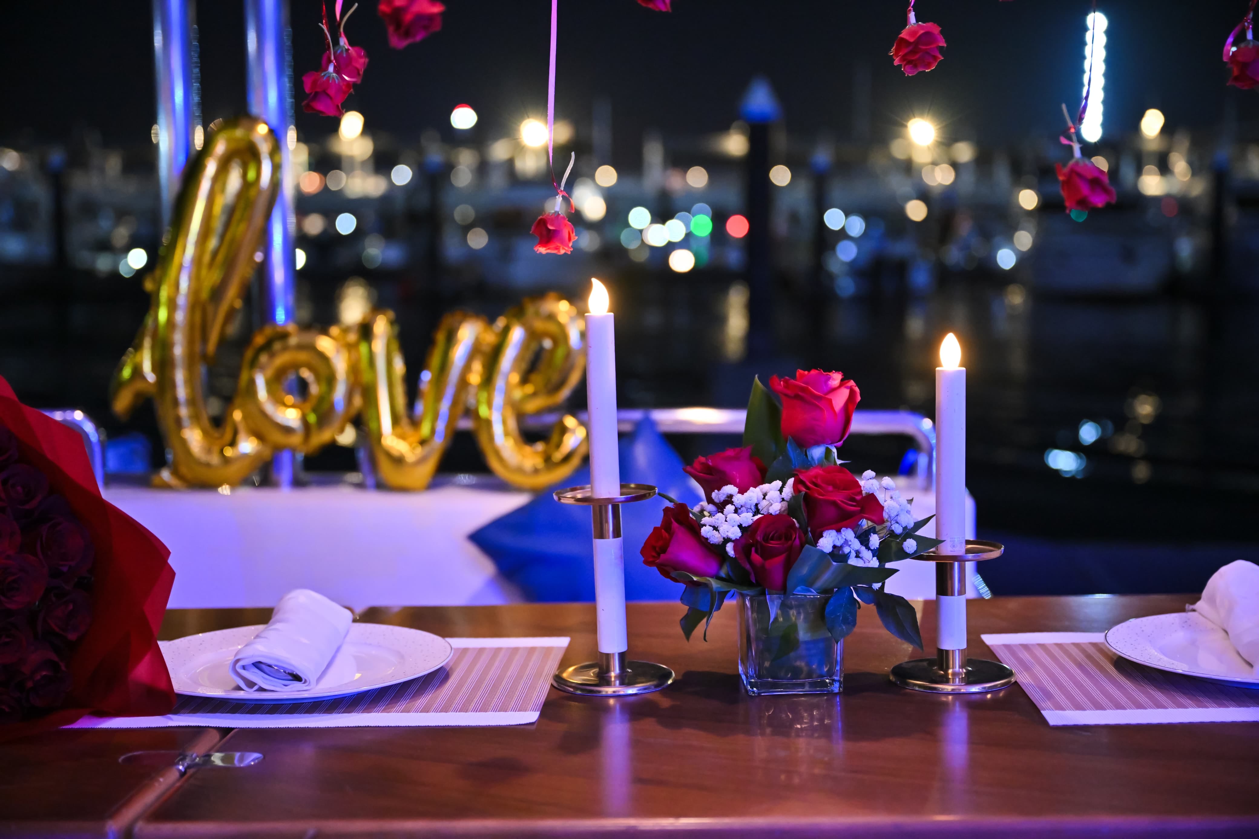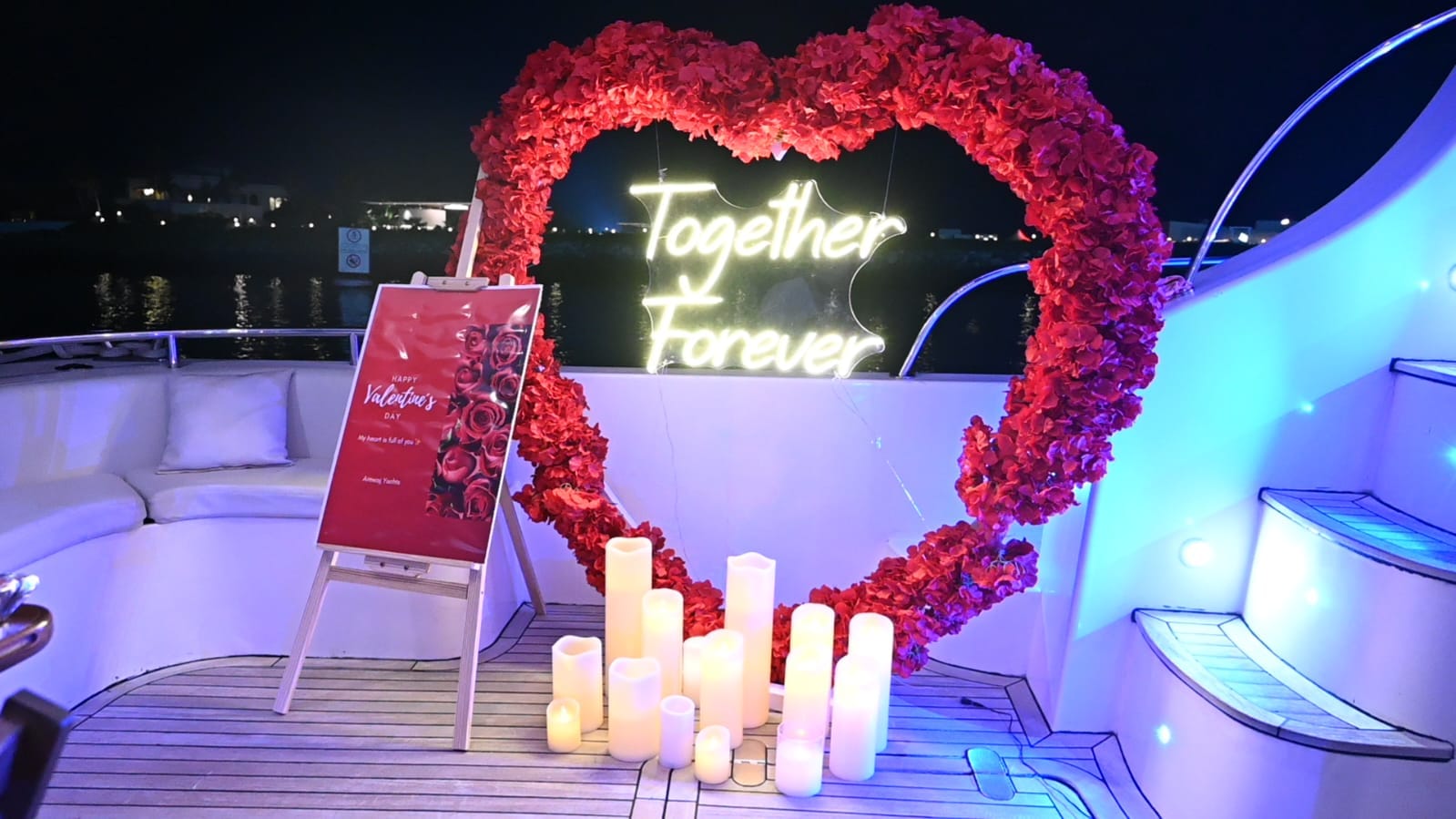 A romantic private Valentine’s Day yacht cruise in Dubai, featuring luxury décor, stunning skyline views, and an unforgettable experience for couples.